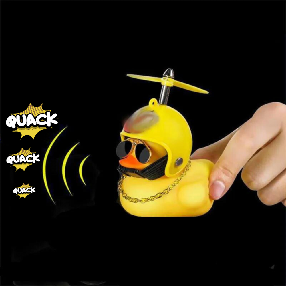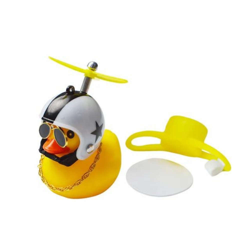 Buzina Bike De Guidão Moto Patinho Amarelo Com Capacete Estrela, Hélice, Cordão e Óculos.