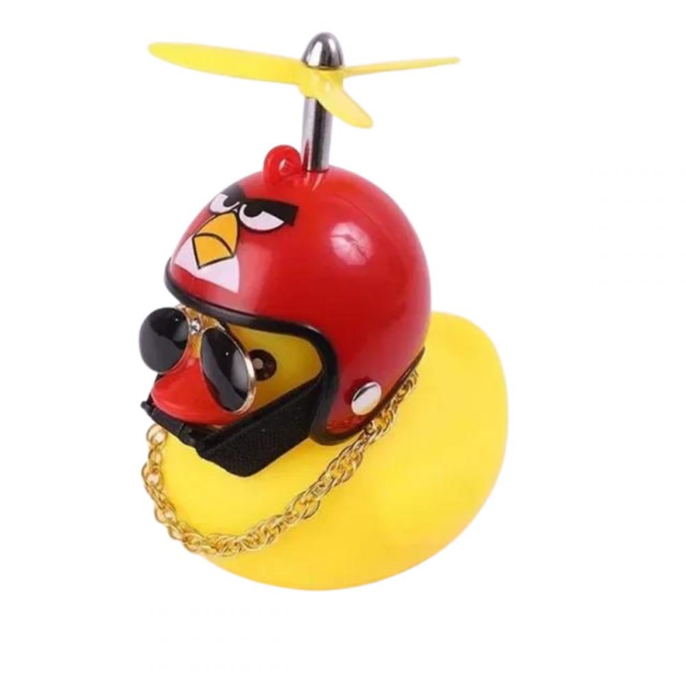 Patinho Pato Borracha com capacete para colocar no painel do carro, retrovisor, na moto ou bicicleta. Faz barulho ao pressionar, desde que o fundo esteja fechado.
