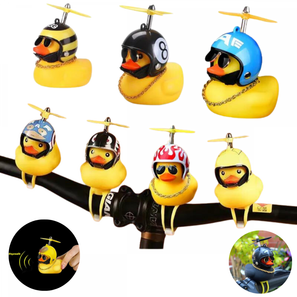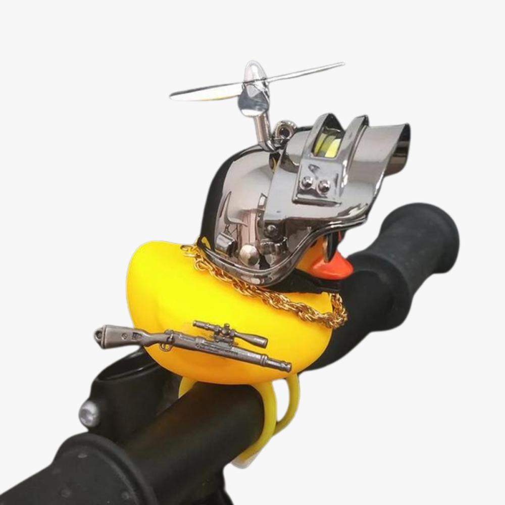 Buzina Bike De Guidão Moto Patinho Amarelo Com Capacete Prata e Hélice, Cordão e Óculos